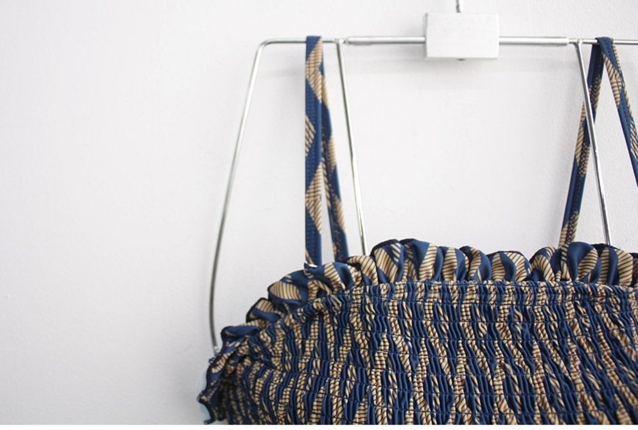 シックな幾何学パターンとバストの繊細なシャーリングでボディラインを綺麗に拾う、大人可愛いデザインのオールインワン水着です。