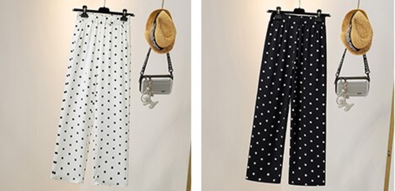 おしゃれ女子注目のドット柄ストレートパンツが登場しました!ウエストゴムで楽ちんな着心地ながら、流行のドット柄がこなれ感を演出。軽やかな素材感で春夏のデイリースタイルをワンランクアップさせる一本です。ルーズなシルエットが女性らしさを引き立て、フェミニンな雰囲気を醸し出してくれます。さりげなく足元を華やかに演出するデザインで、コーディネートの主役としても活躍間違いなし!この一本で、どんなシーンもおしゃれに彩ってくれること間違いなしです。