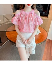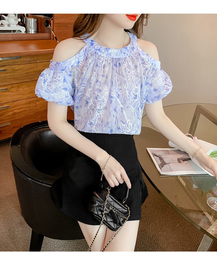 ブラウス トップス シフォン オープンショルダー 刺繍 ステッチ ホルターネック パフスリーブ プルオーバー 透け感 シアー 半袖 バルーンスリーブ S M L XL 2XL 大人可愛い シンプル 上品 お洒落 こなれ感 無地 10代 20代 30代 40代 オフィス ビジネス OL 通勤 学生 通学 デート お出かけ 休日 イベント デイリー 普段使い ピンク パープルブルー | GVON ファッションショップ