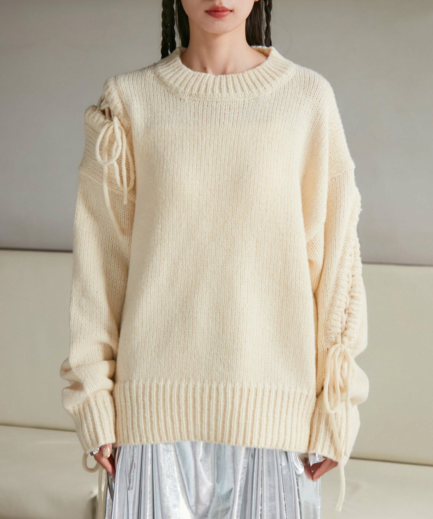 ランダムなレースアップ切り替えでさり気なく肌を見せるビッグシルエットセーターです。