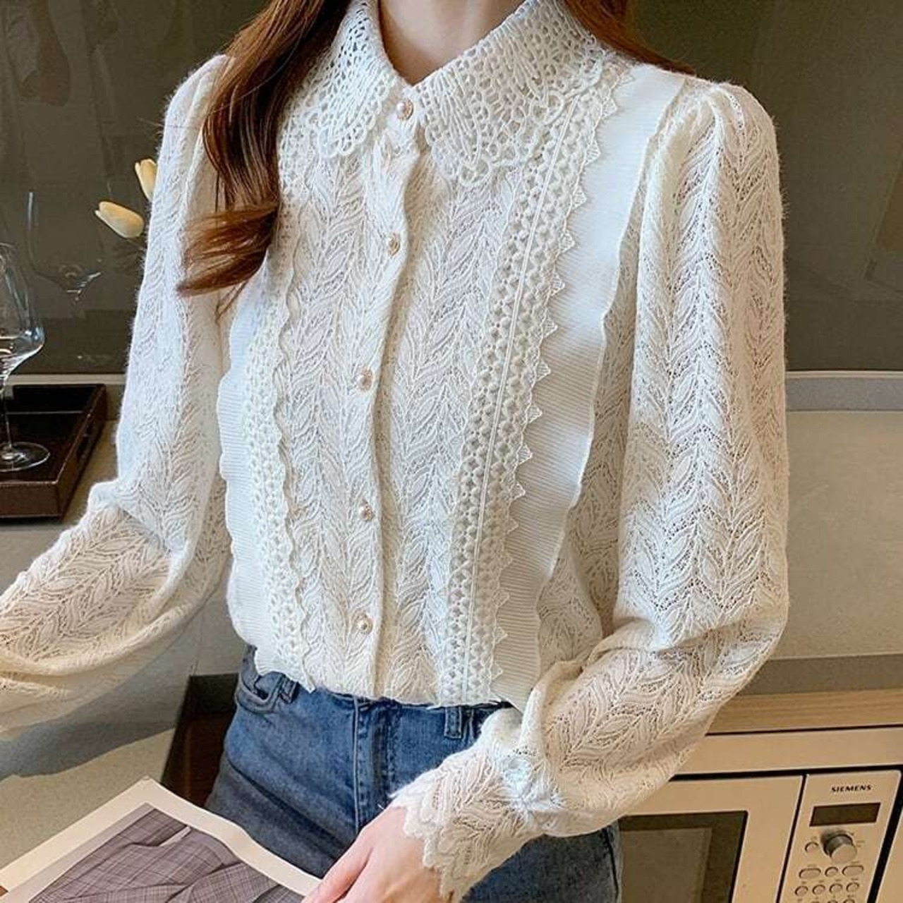 ブラウス トップス シフォン レギュラーカラー 総レース 透け感 シフォン 花柄 クロシェ 襟コンシャス スカラップ リボン ギャザー パフスリーブ 前開き シアー 長袖 S M L XL 2XL ベージュ 大人可愛い シンプル 上品 お洒落 こなれ感 無地 10代 20代 30代 40代 オフィス ビジネス OL 通勤 学生 通学 デート お出かけ 休日 イベント デイリー 普段使い | GVON ファッションショップ