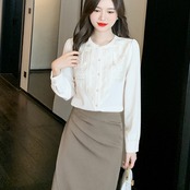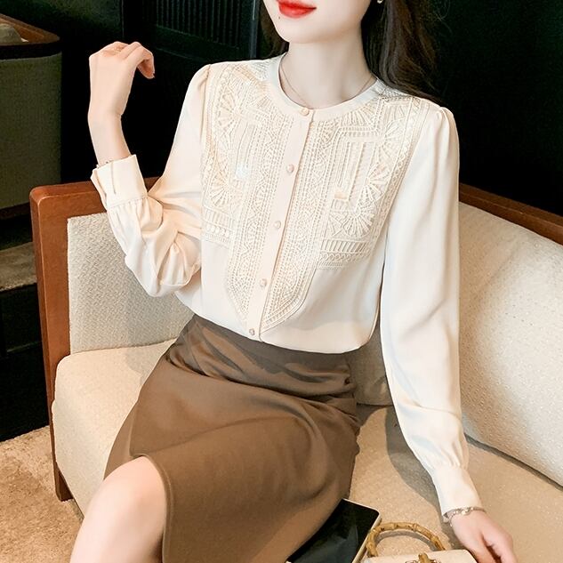 クラシカルなレース仕立てのフロントデザインが華やかな前開きタイプのシフォンブラウス。