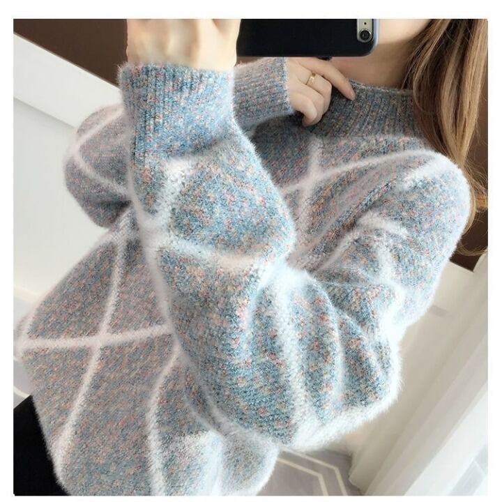 セーター ニット トップス スタンドカラー ハーフハイネック チェック柄 格子柄 ワイド ビッグシルエット モヘア メランジ ドロップショルダー 長袖 パフスリーブ ブルー S 大人可愛い シンプル 上品 お洒落 こなれ感 無地 10代 20代 30代 40代 オフィス ビジネス OL 通勤 学生 通学 デート お出かけ 休日 イベント デイリー 普段使い | GVON ファッションショップ